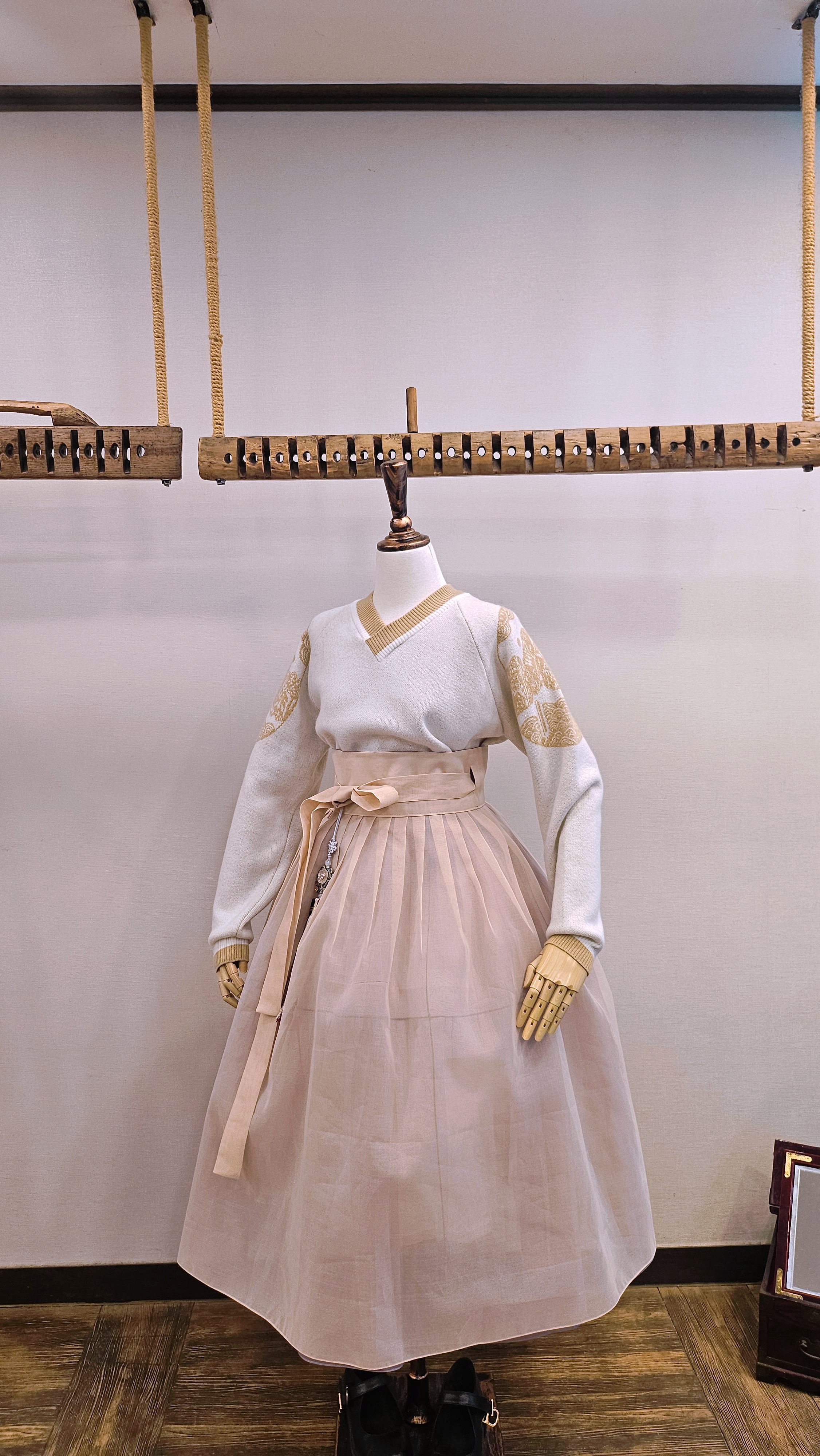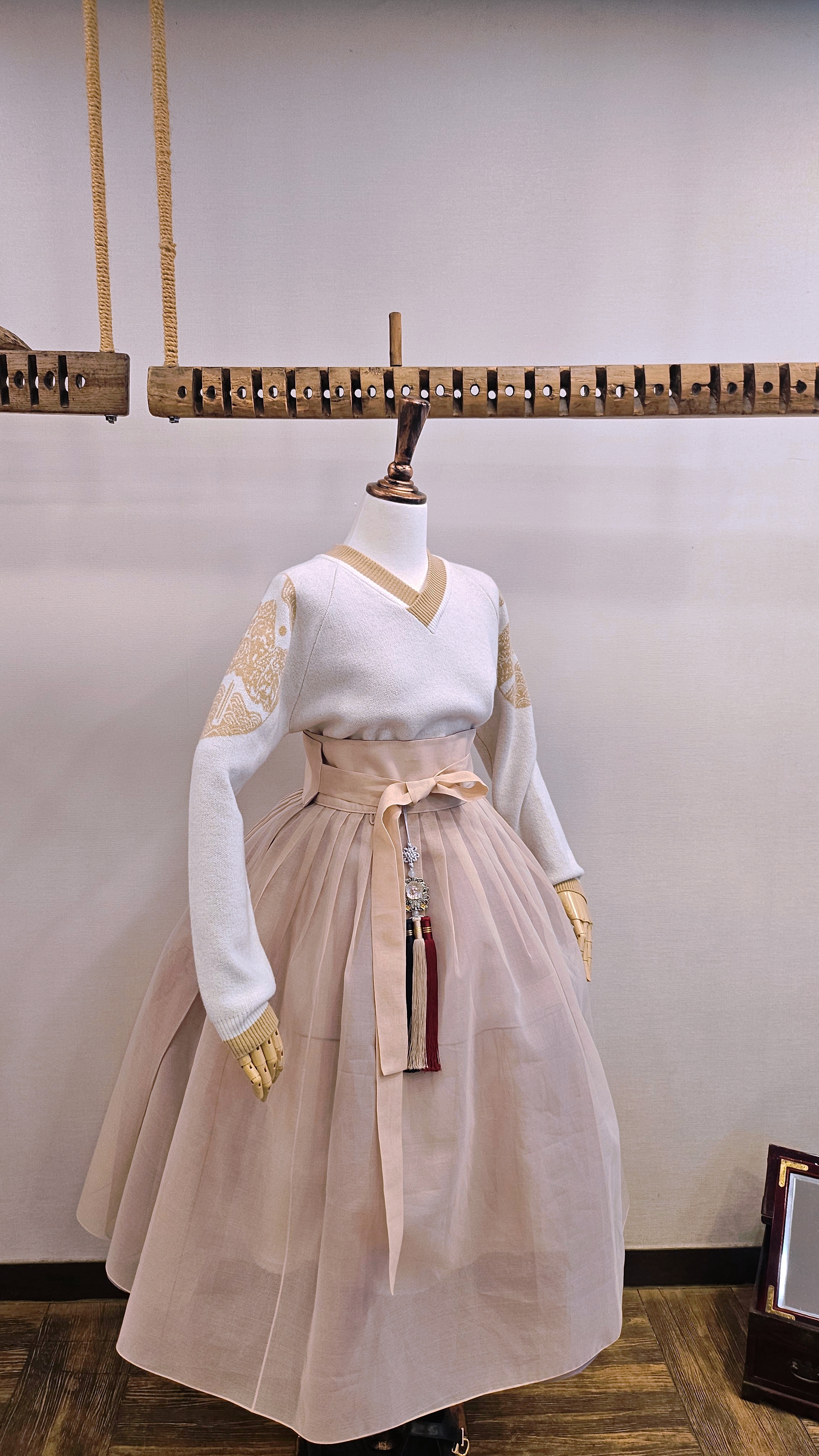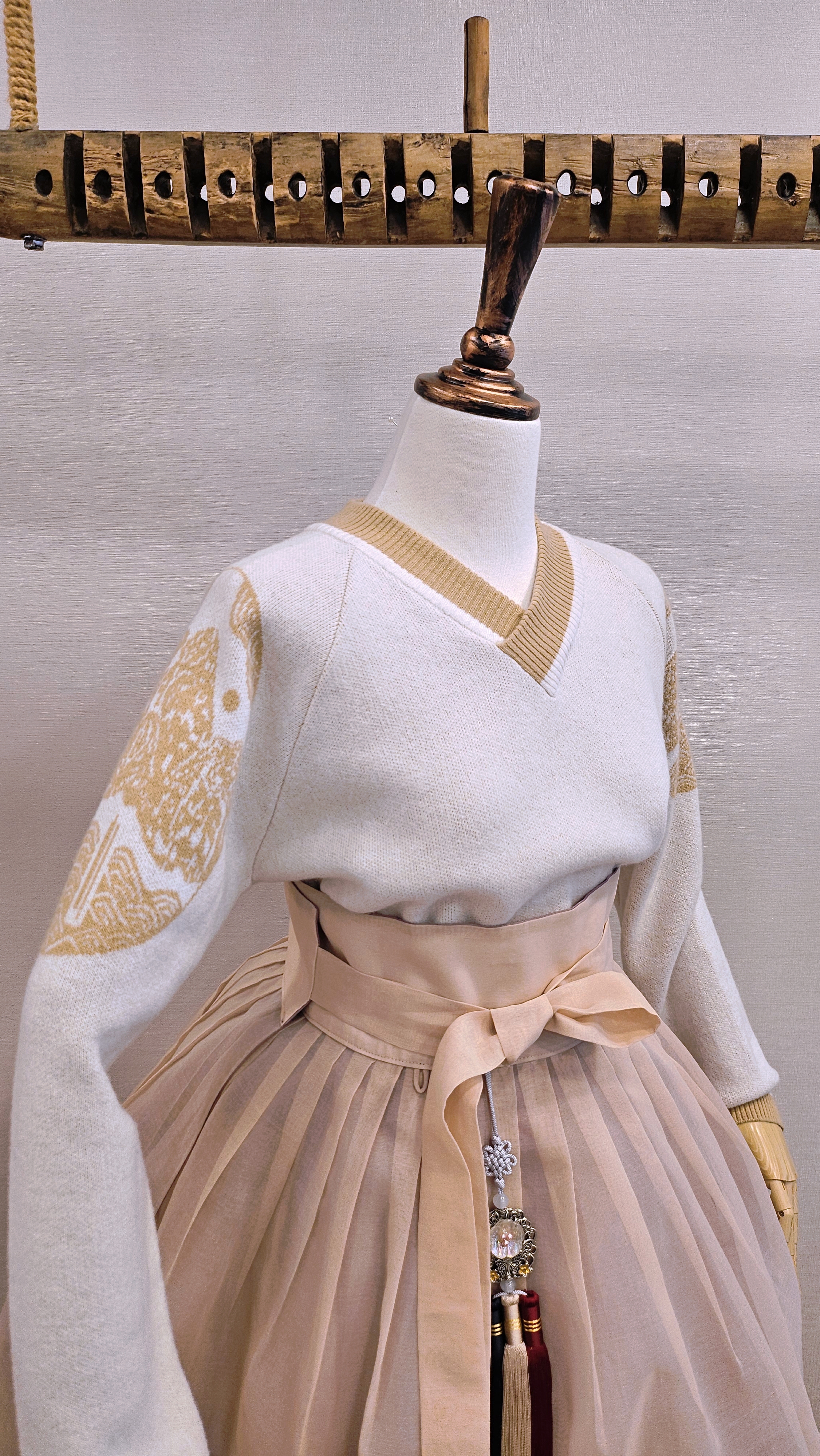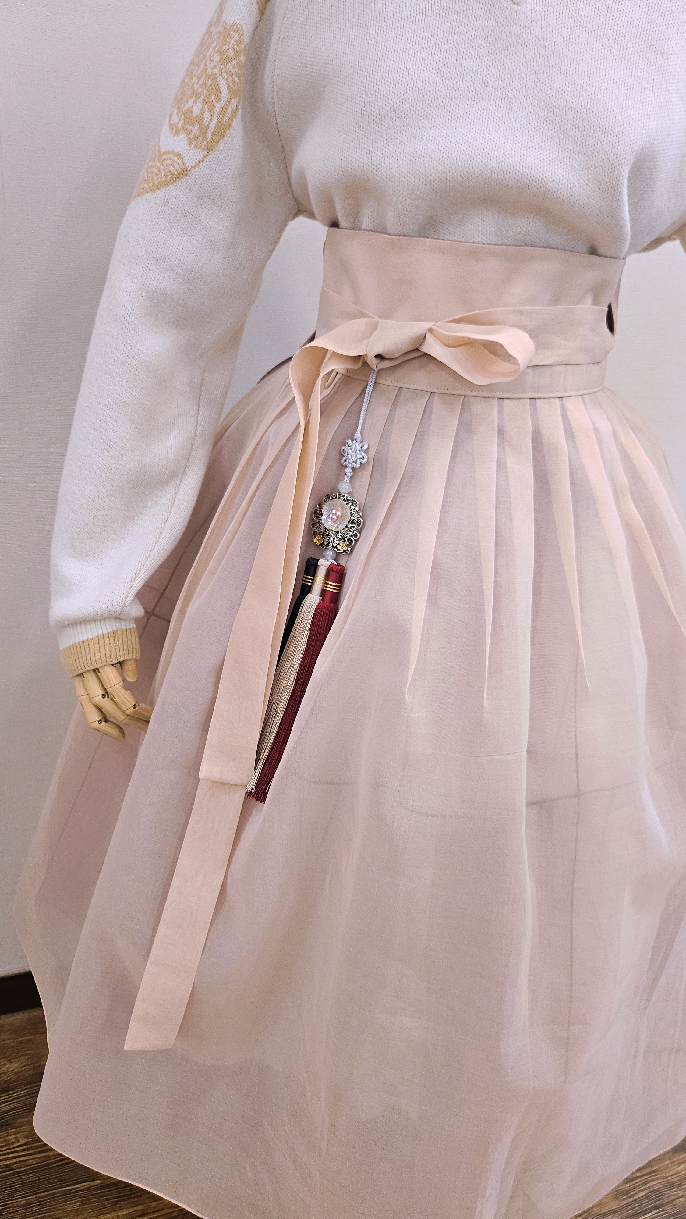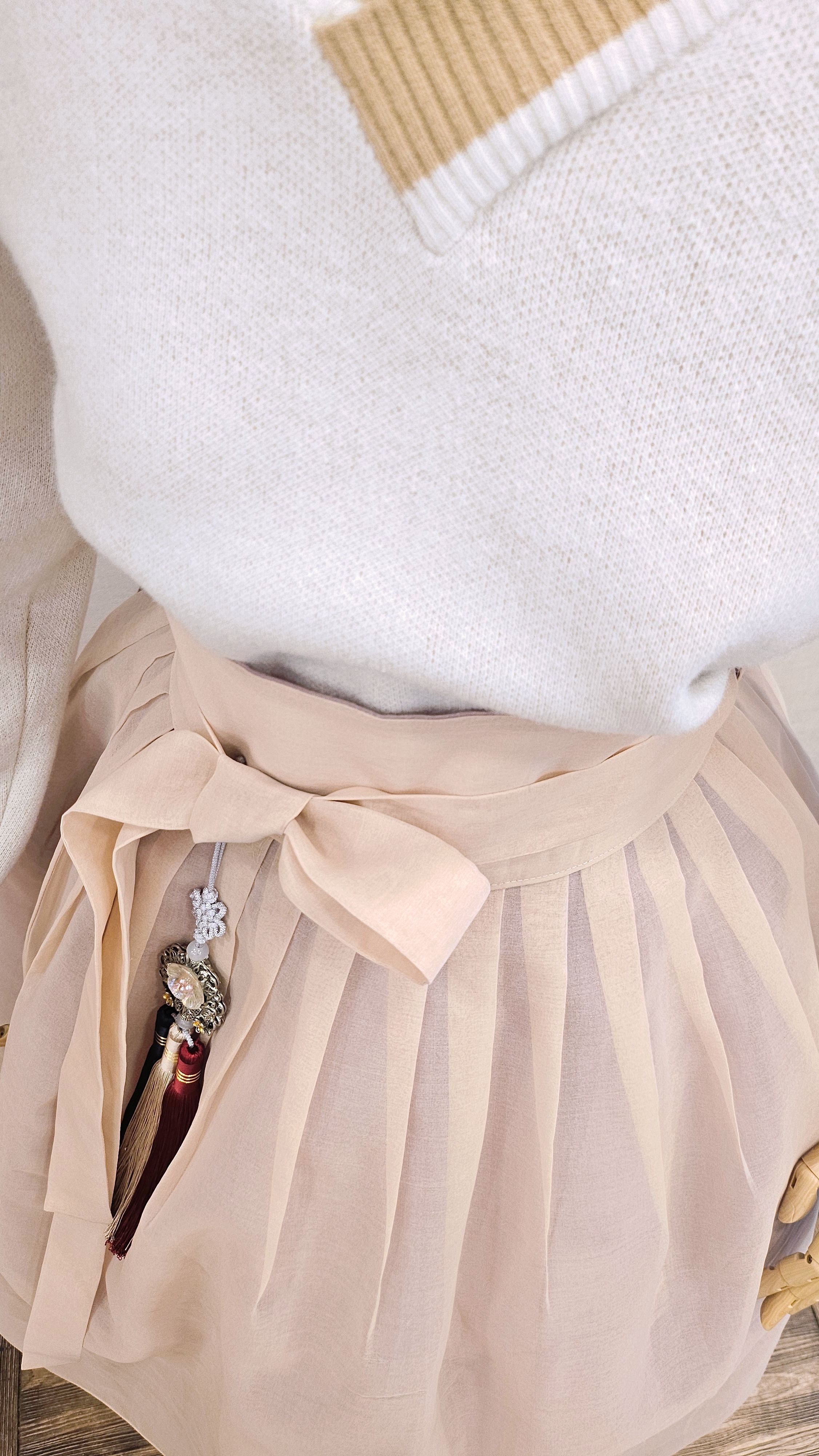 단정한 한복치마 외주름을 잡은 반대쪽 베이지컬러 스커트