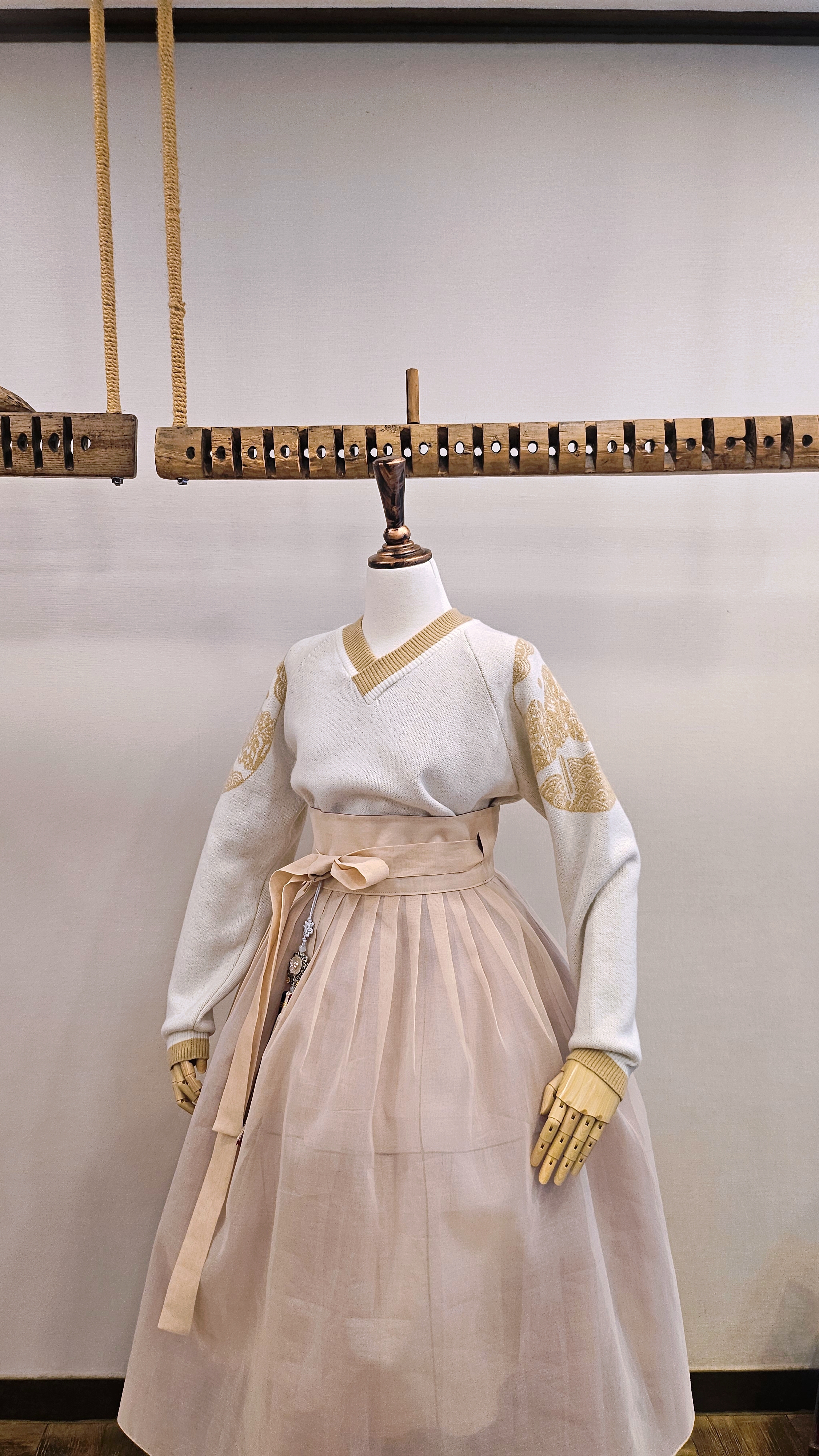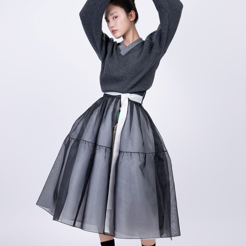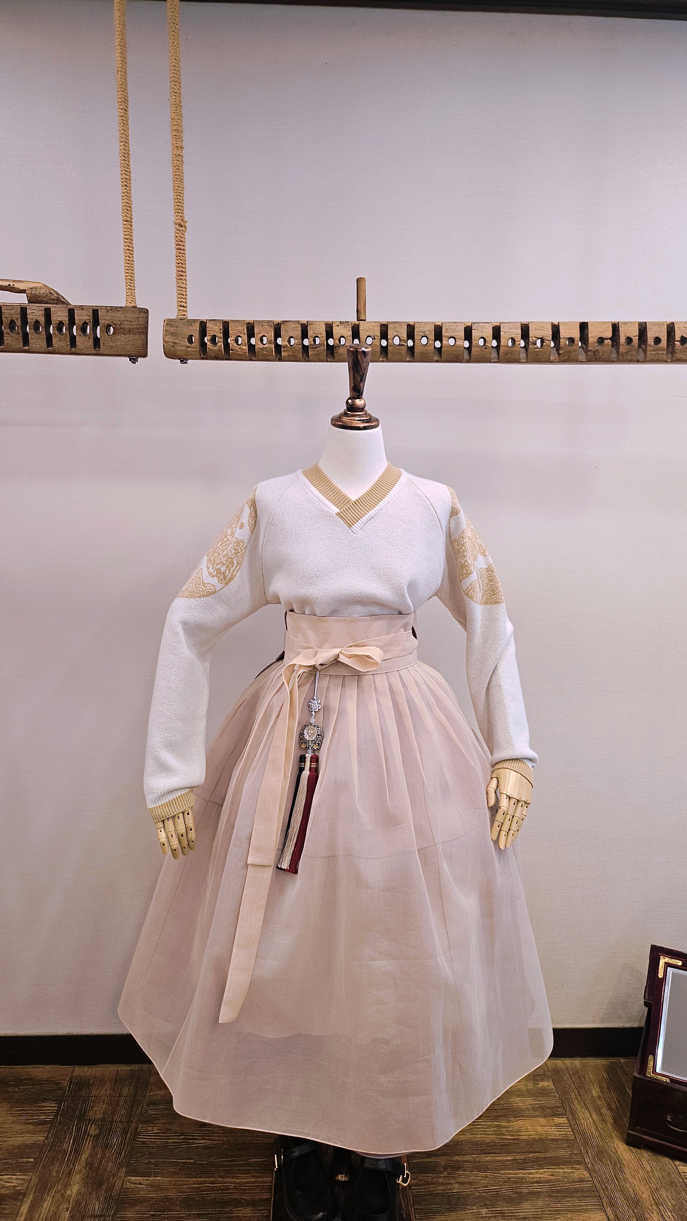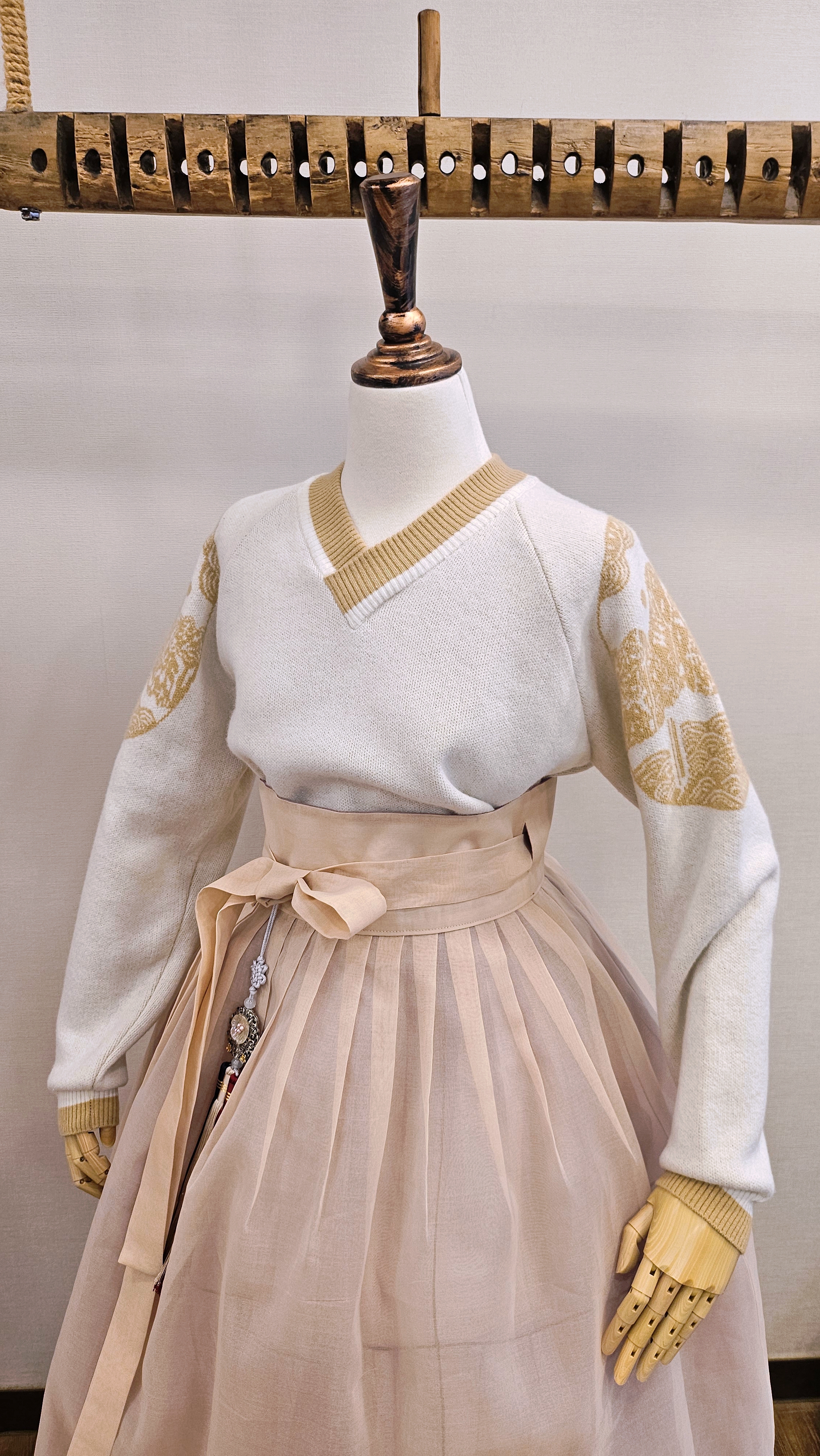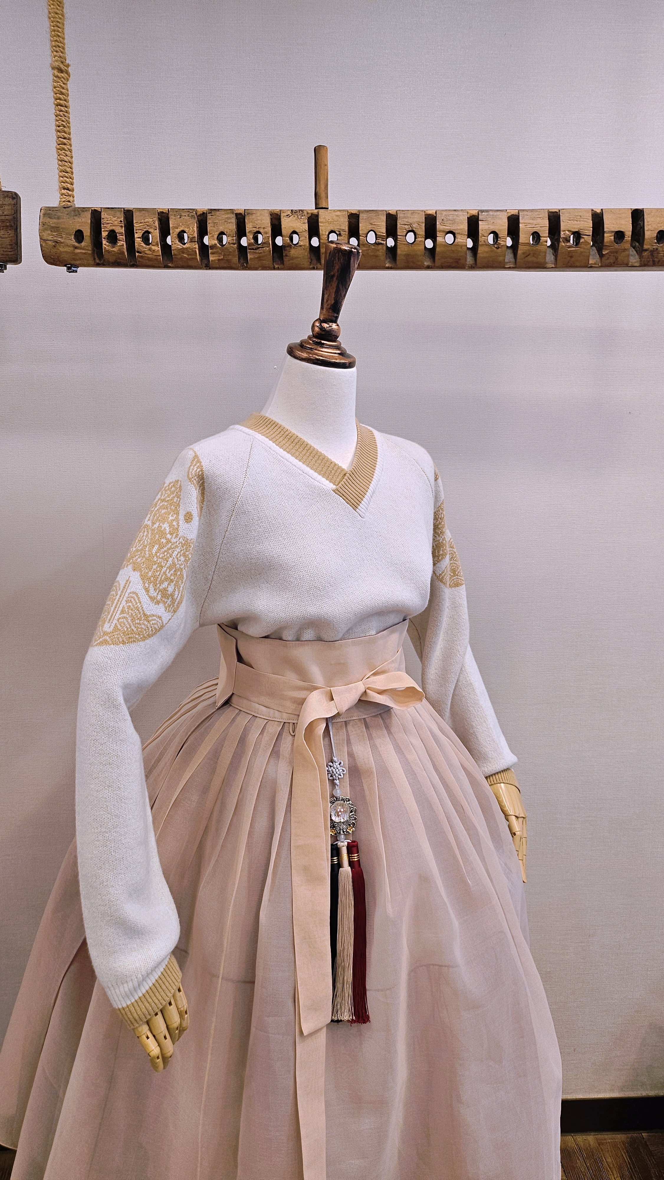 단정한 한복치마 외주름을 잡은 반대쪽 베이지컬러 스커트
