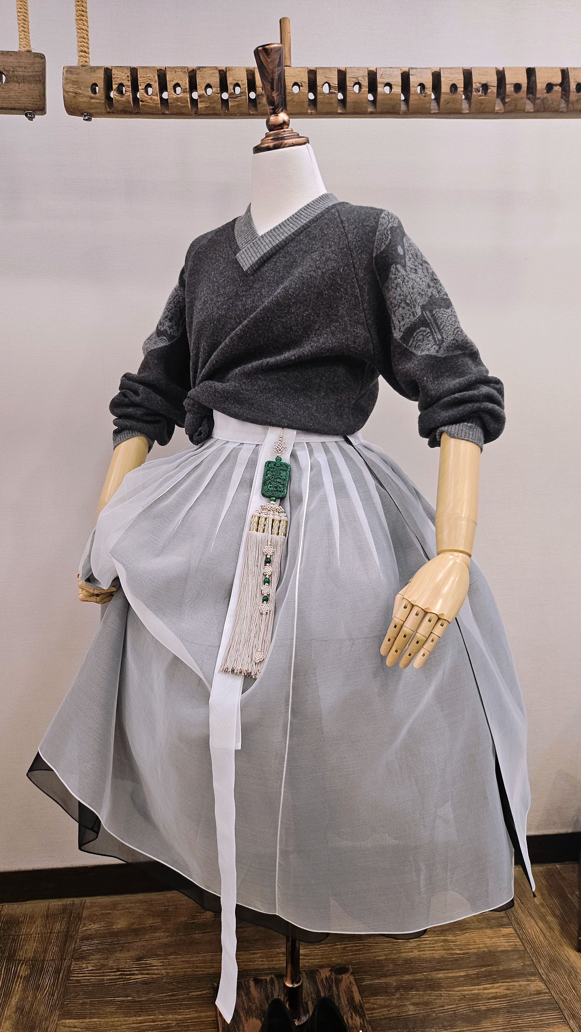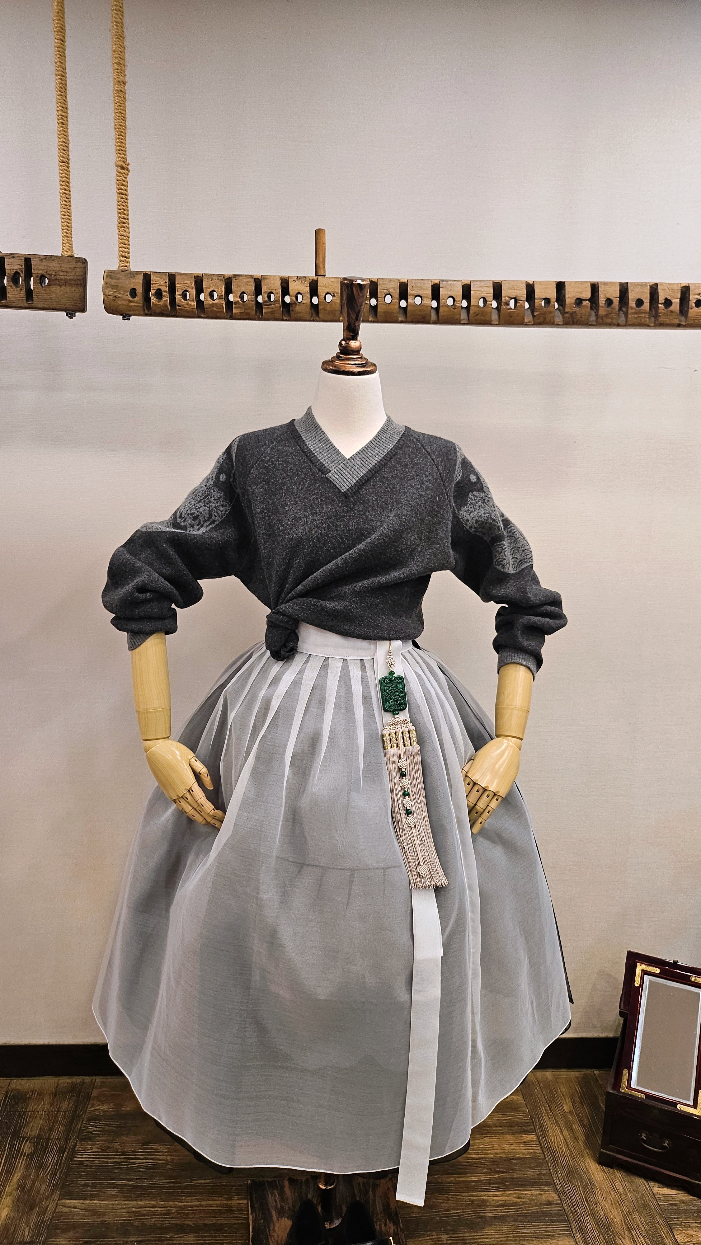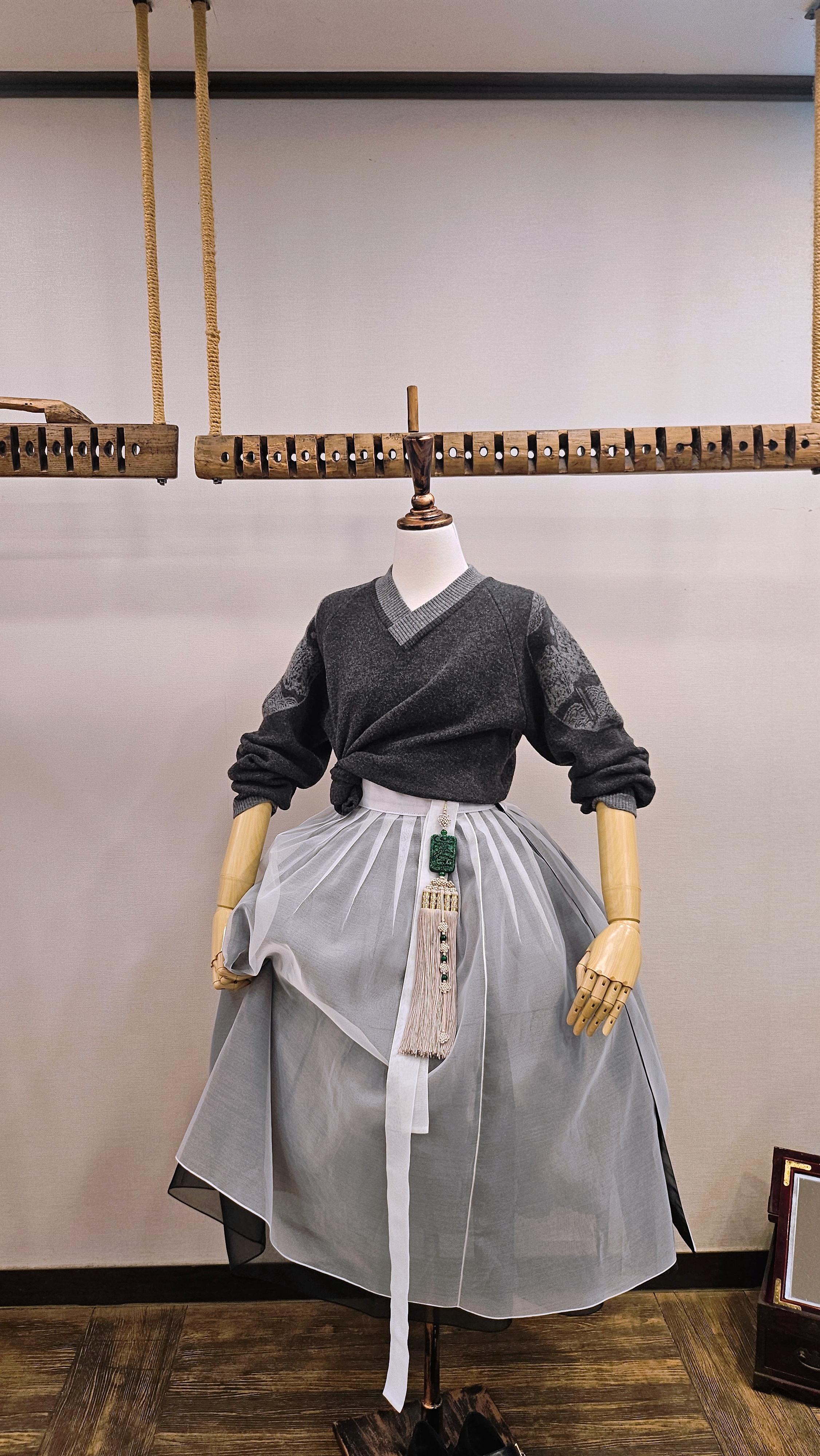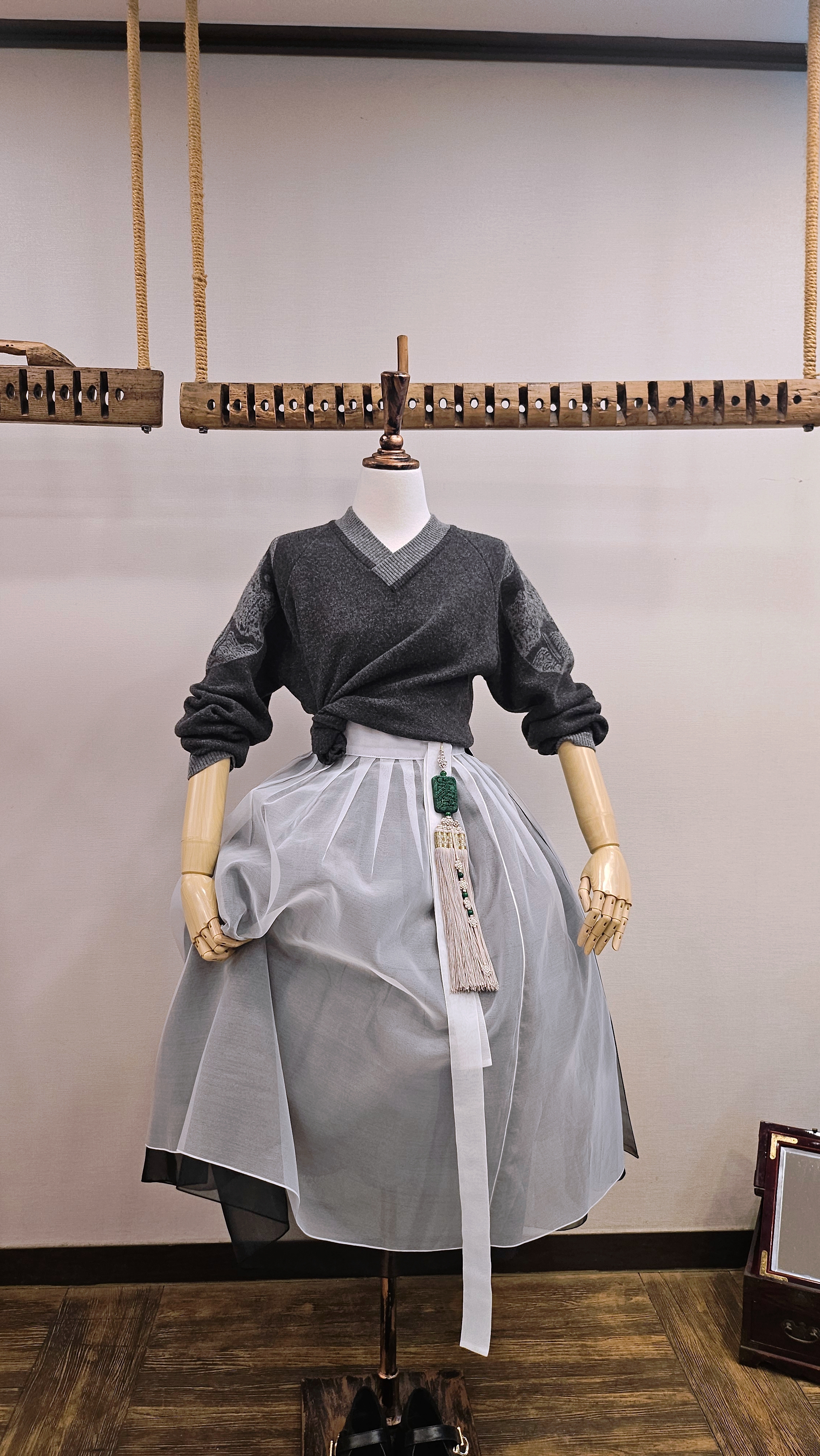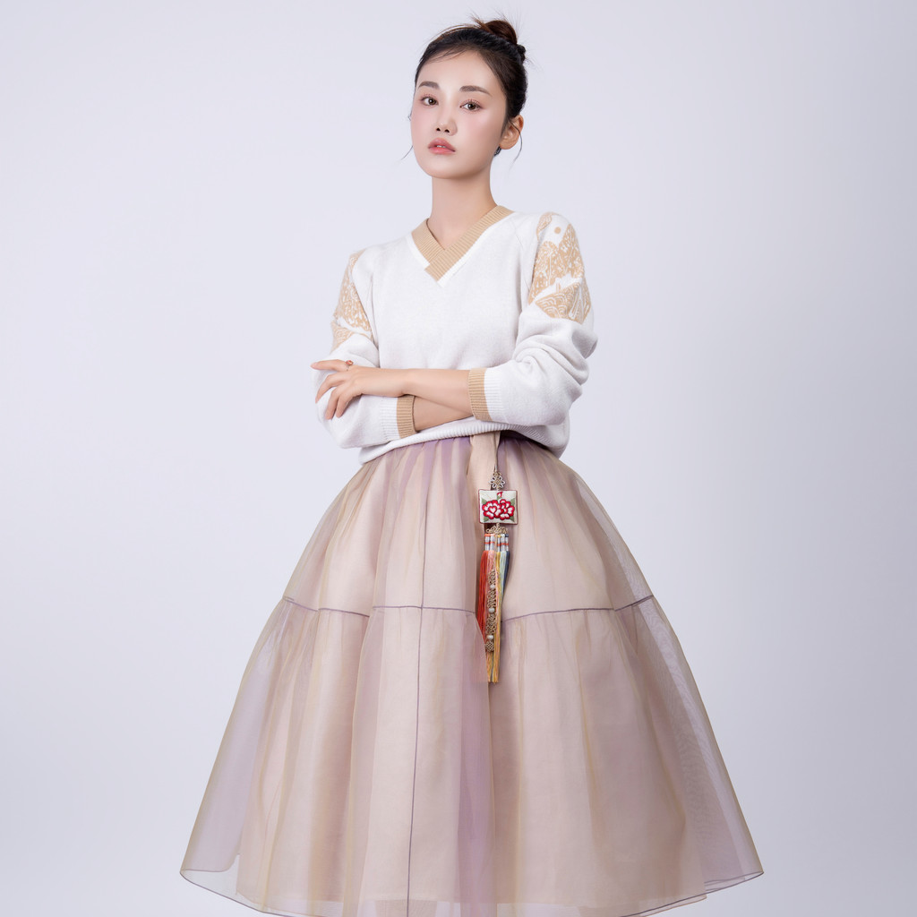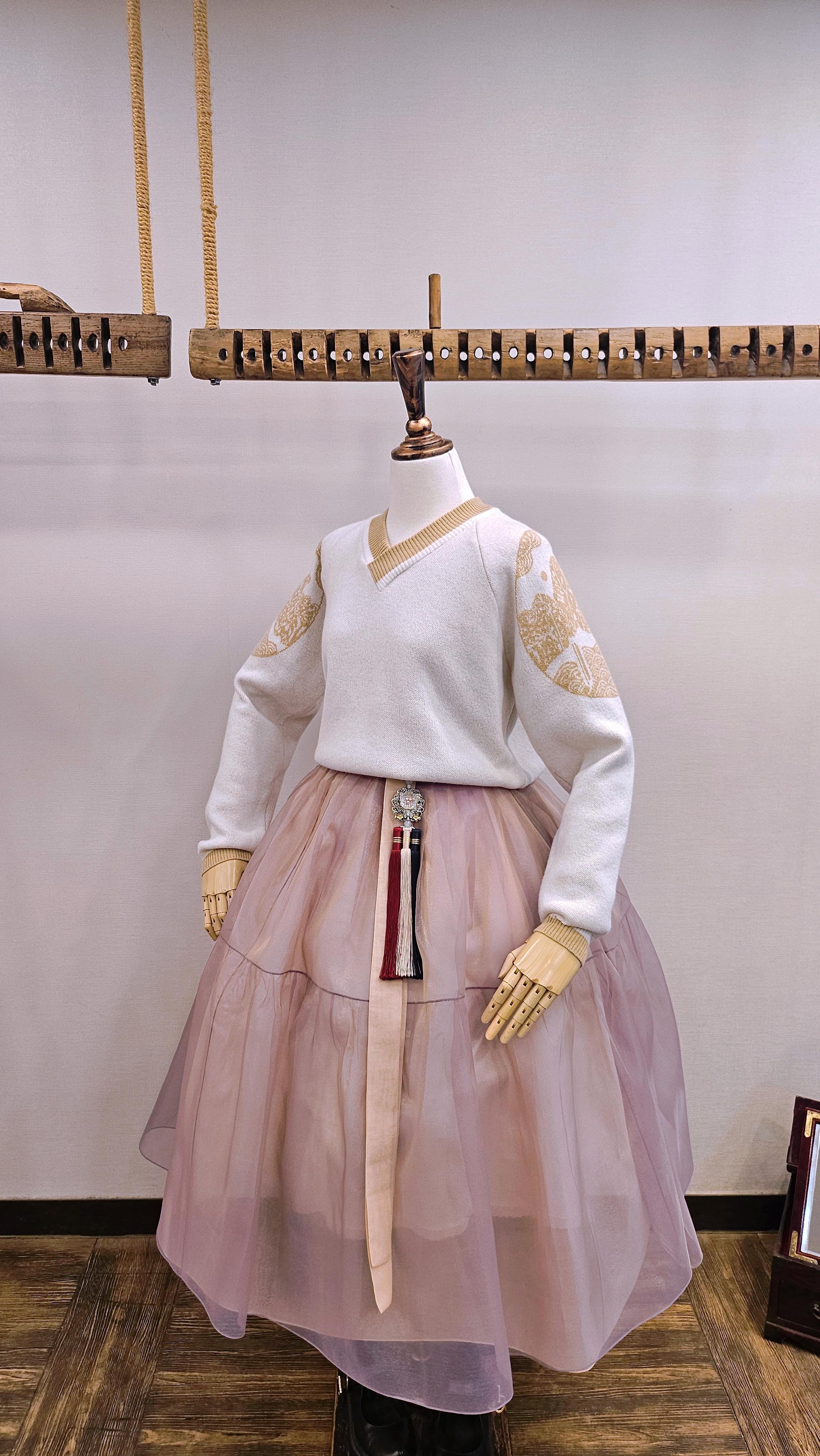 단정한 한복치마 외주름을 잡은 반대쪽 베이지컬러 스커트