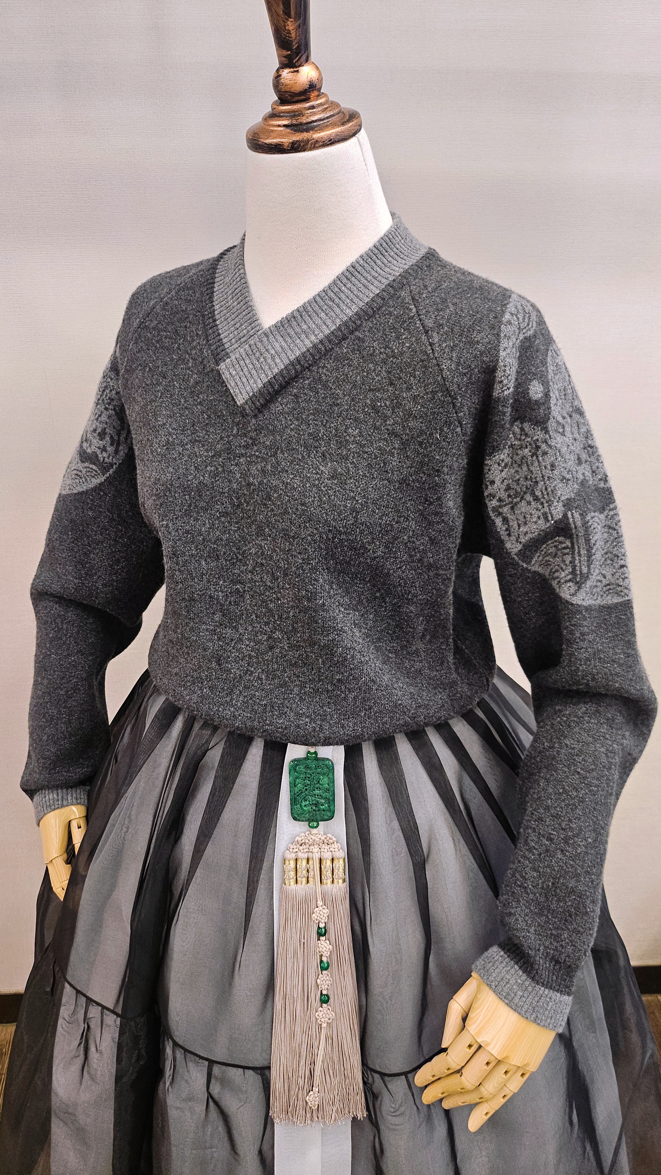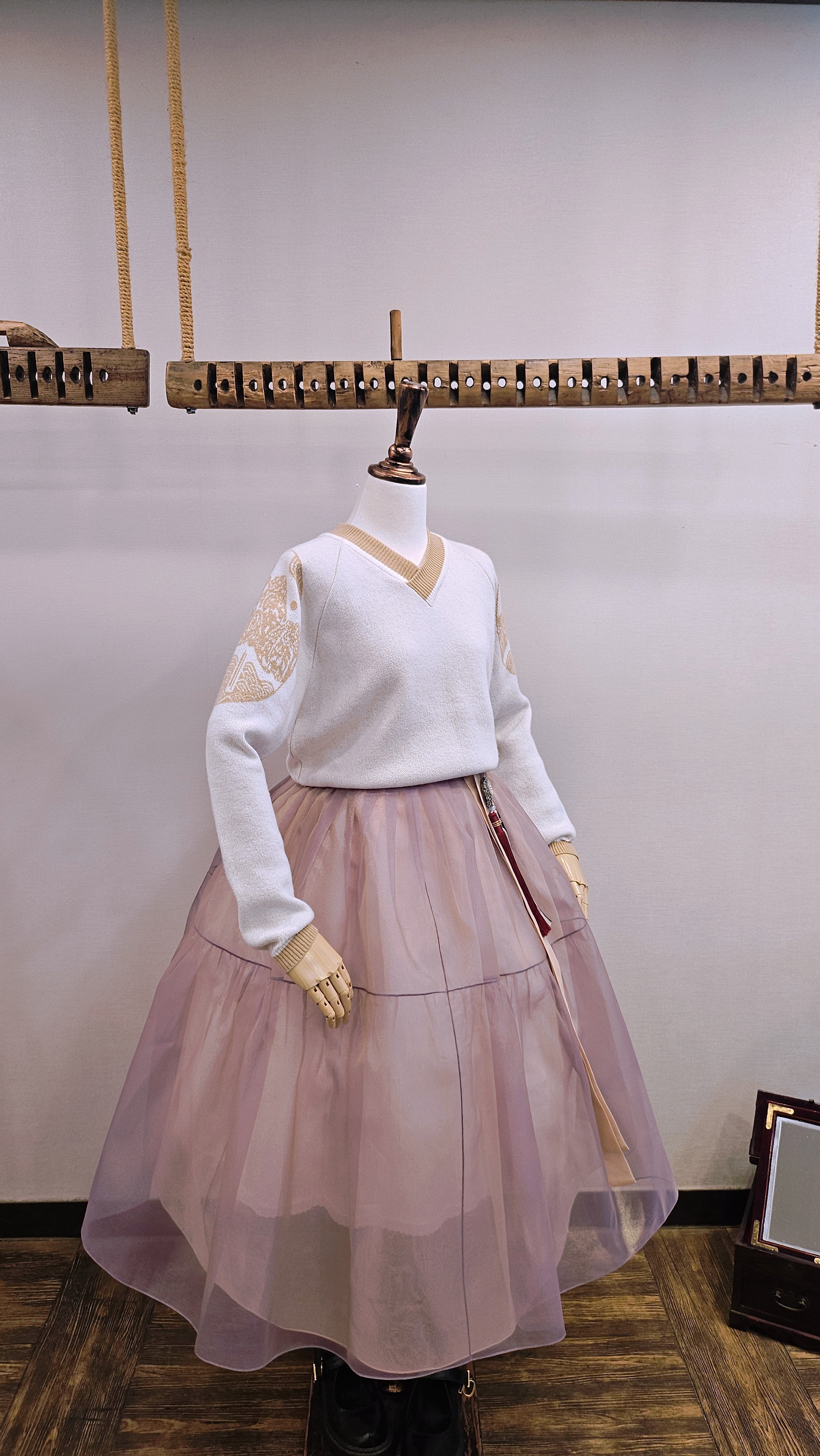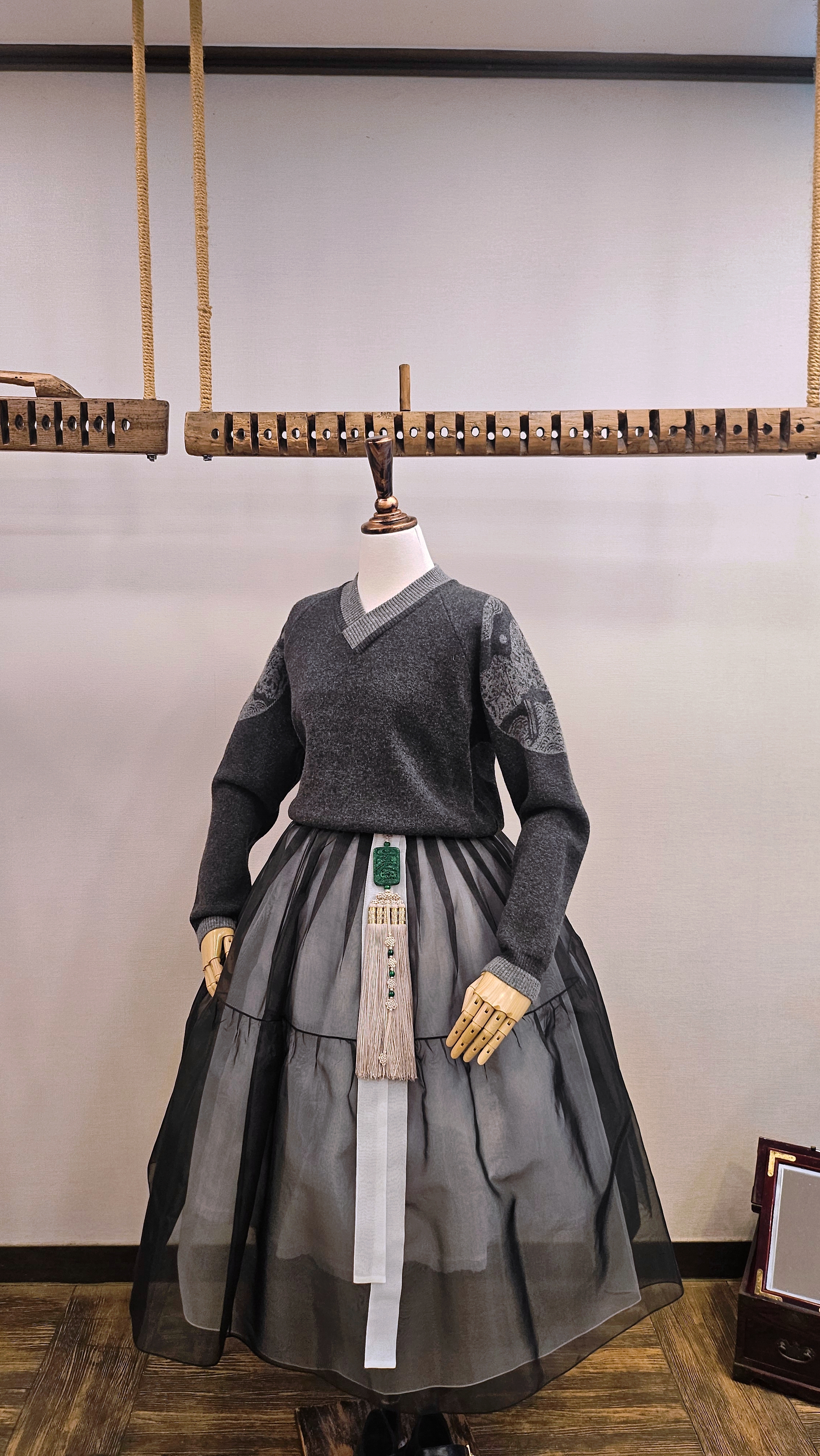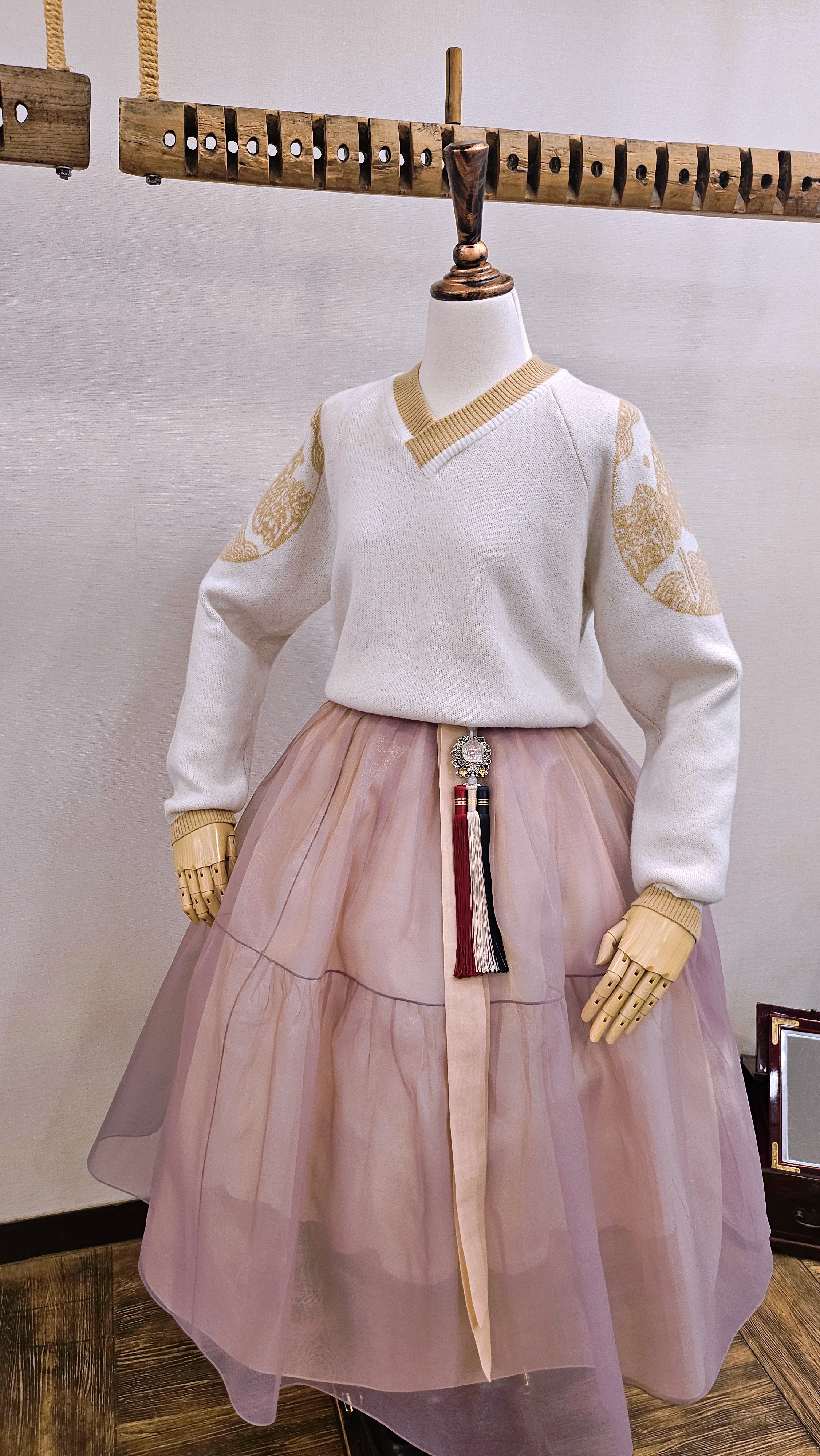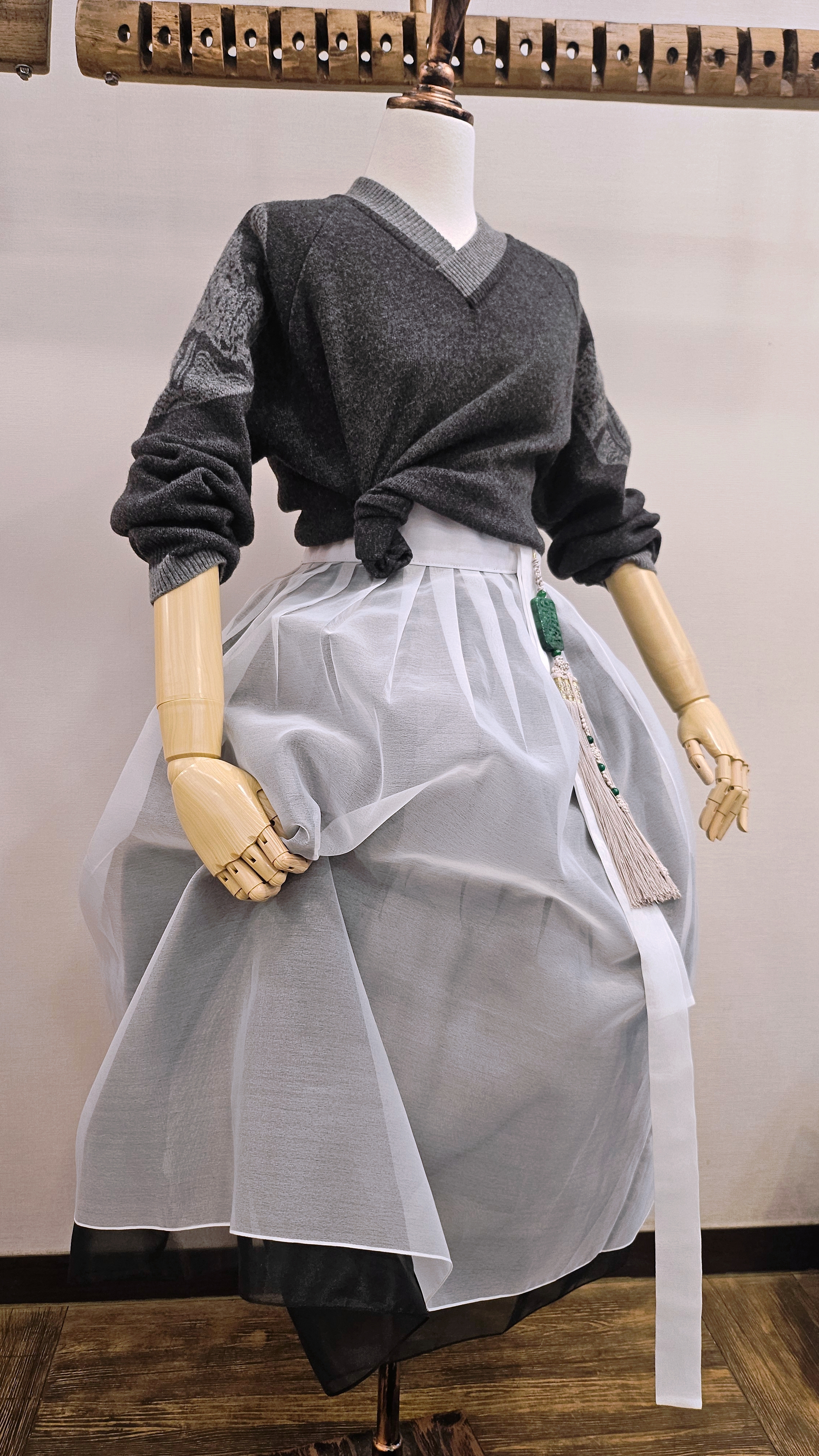 단정한 한복치마 외주름을 잡은 반대쪽 베이지컬러 스커트