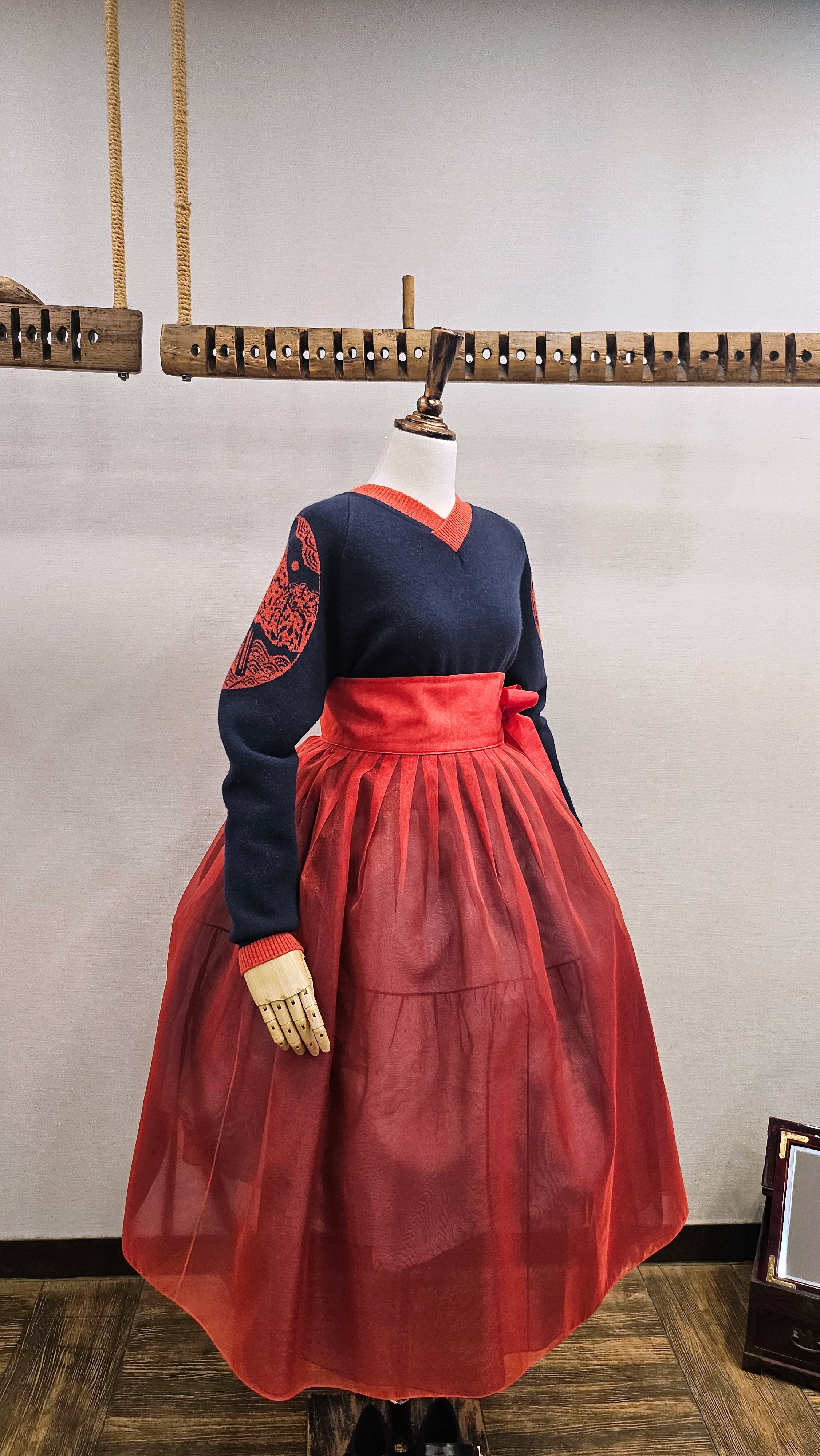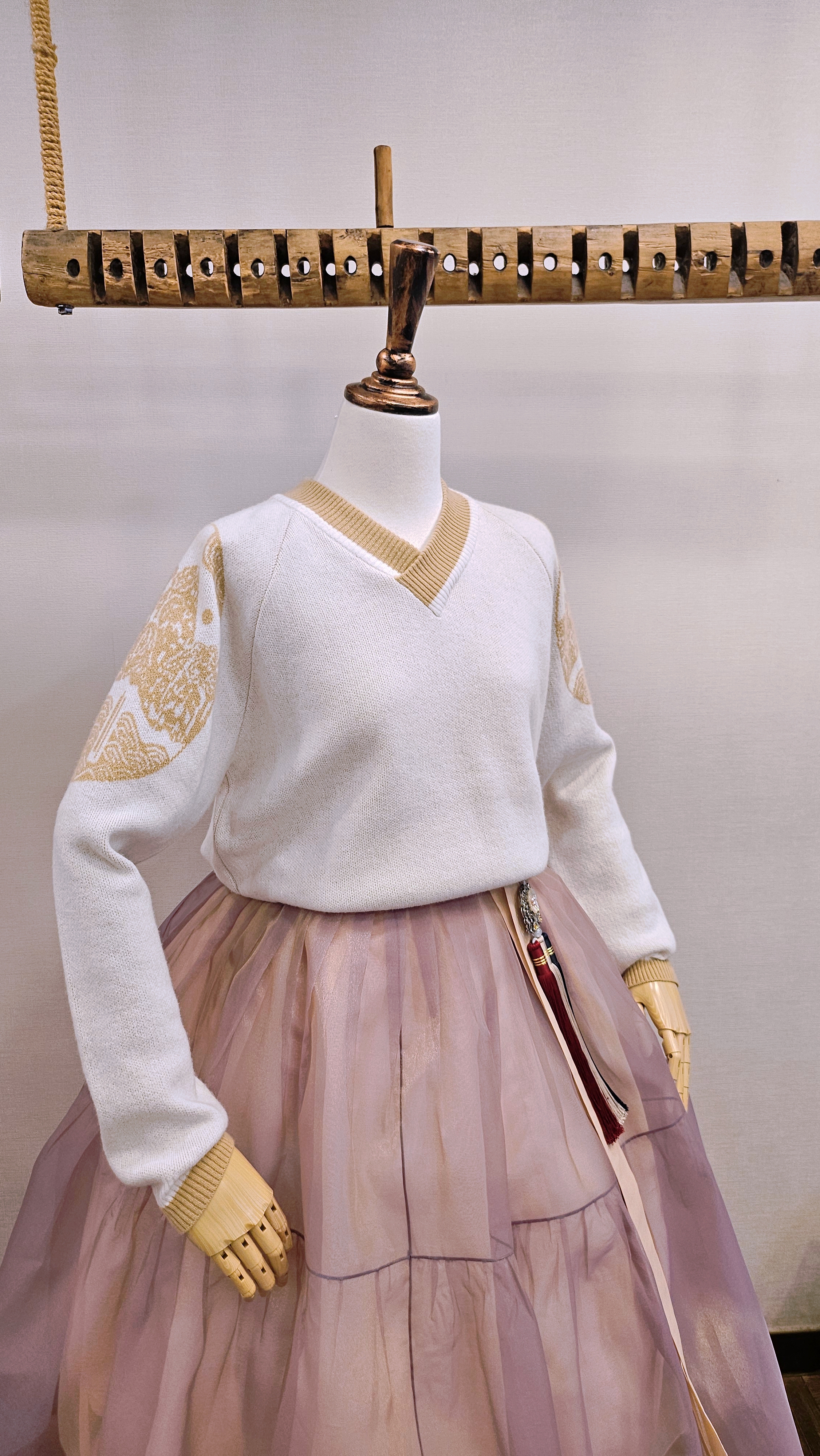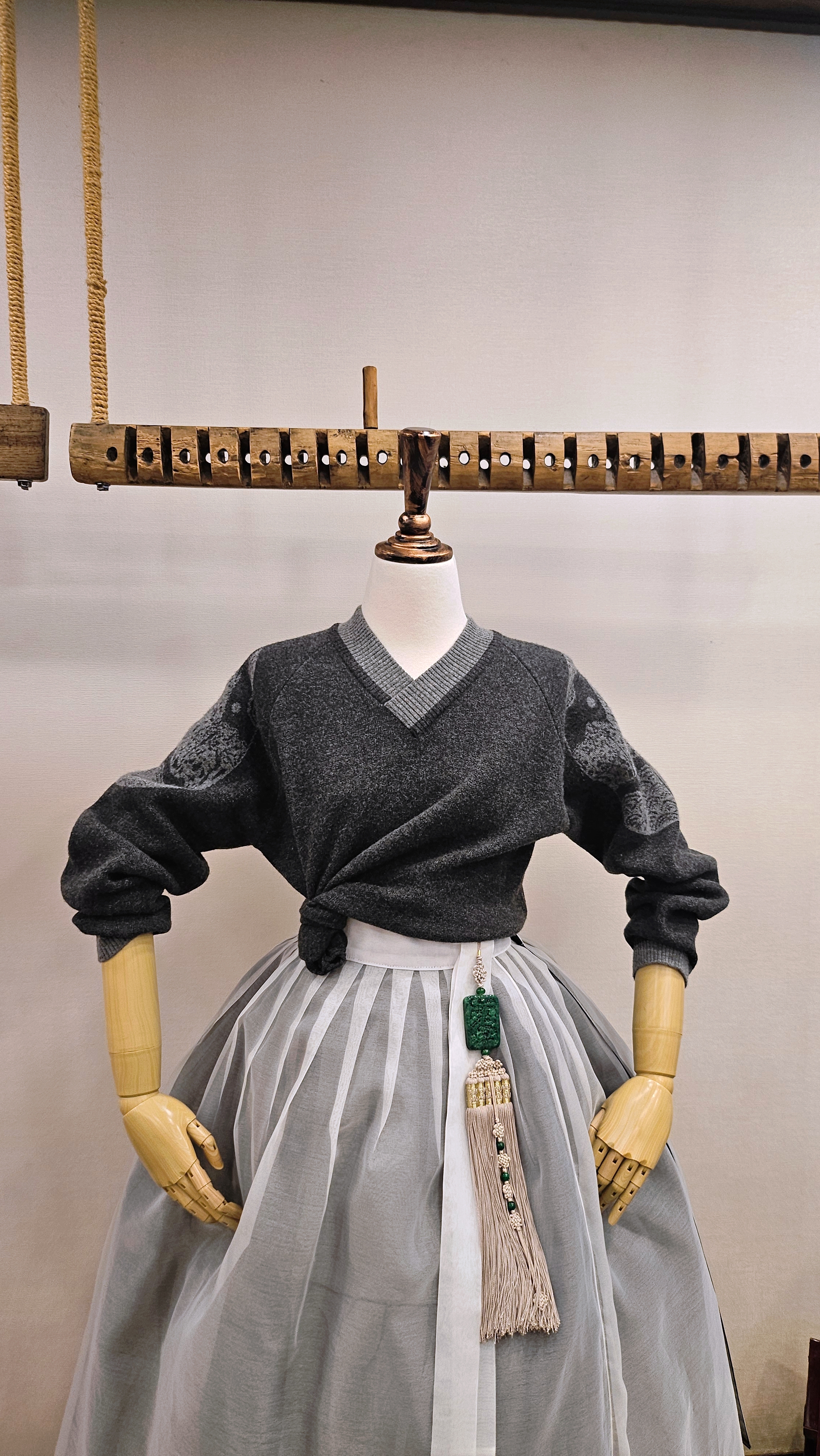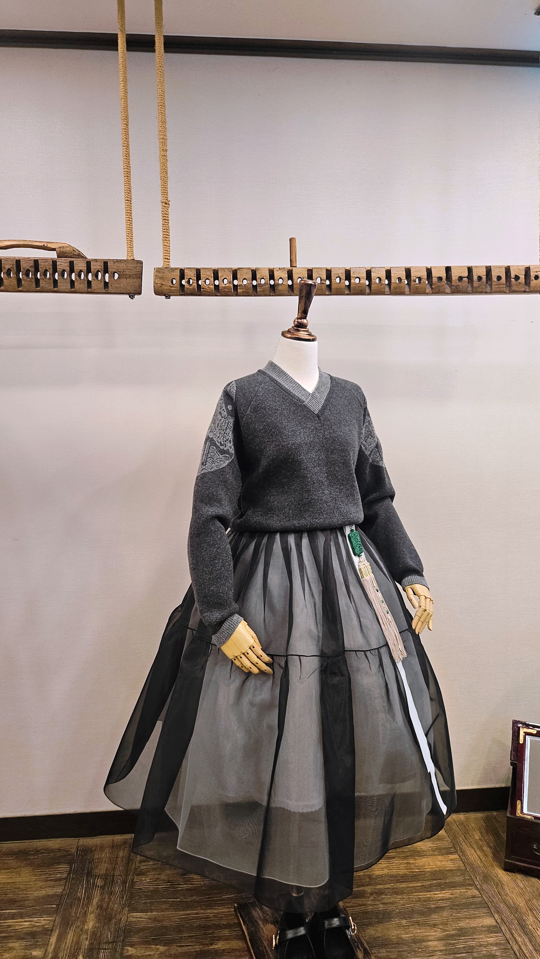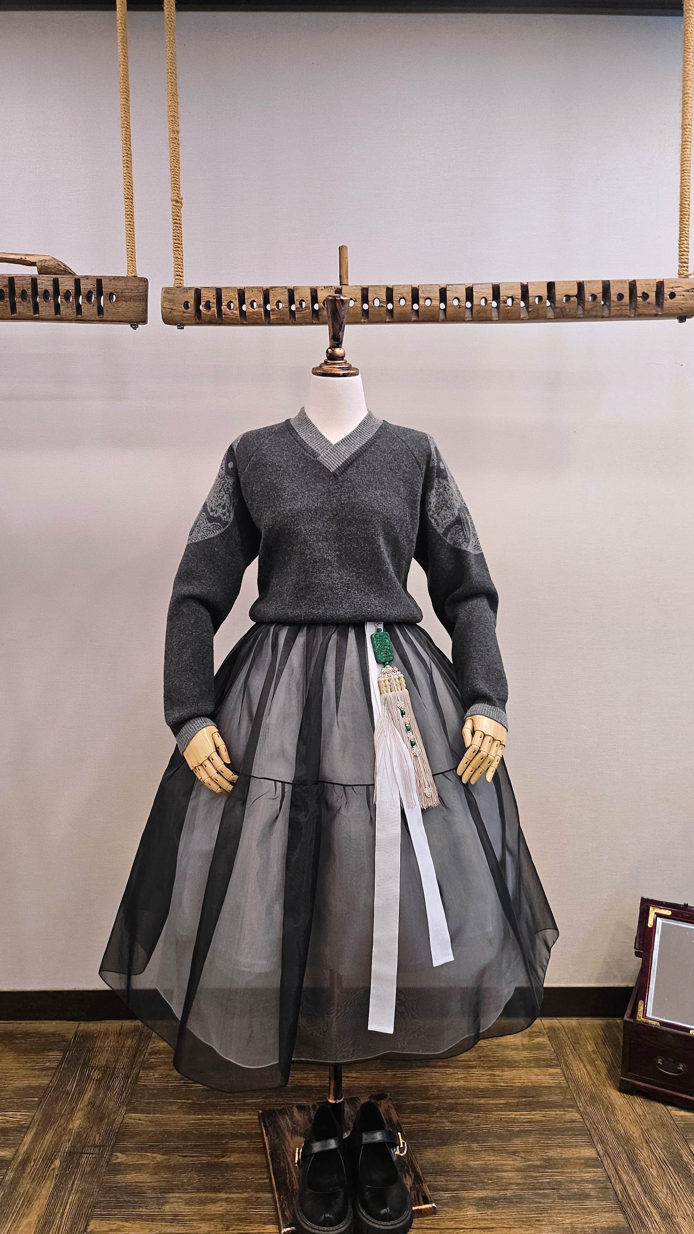 단정한 한복치마 외주름을 잡은 반대쪽 베이지컬러 스커트