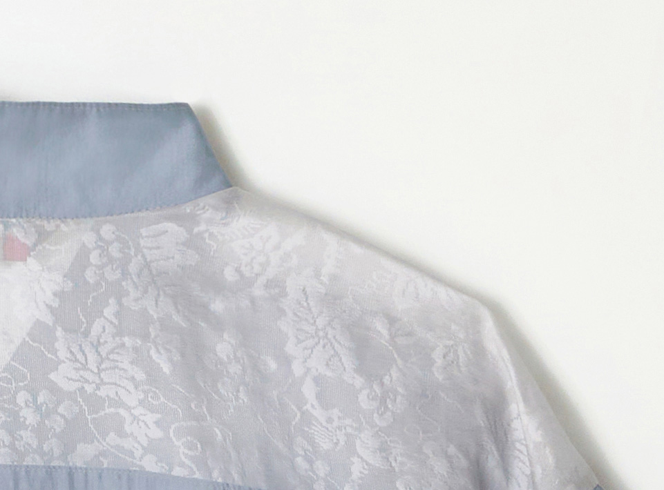 가볍고 은은한 광택감이 있습니다. 소매에 잔잔한 셔링과 주름장식이 조화롭게